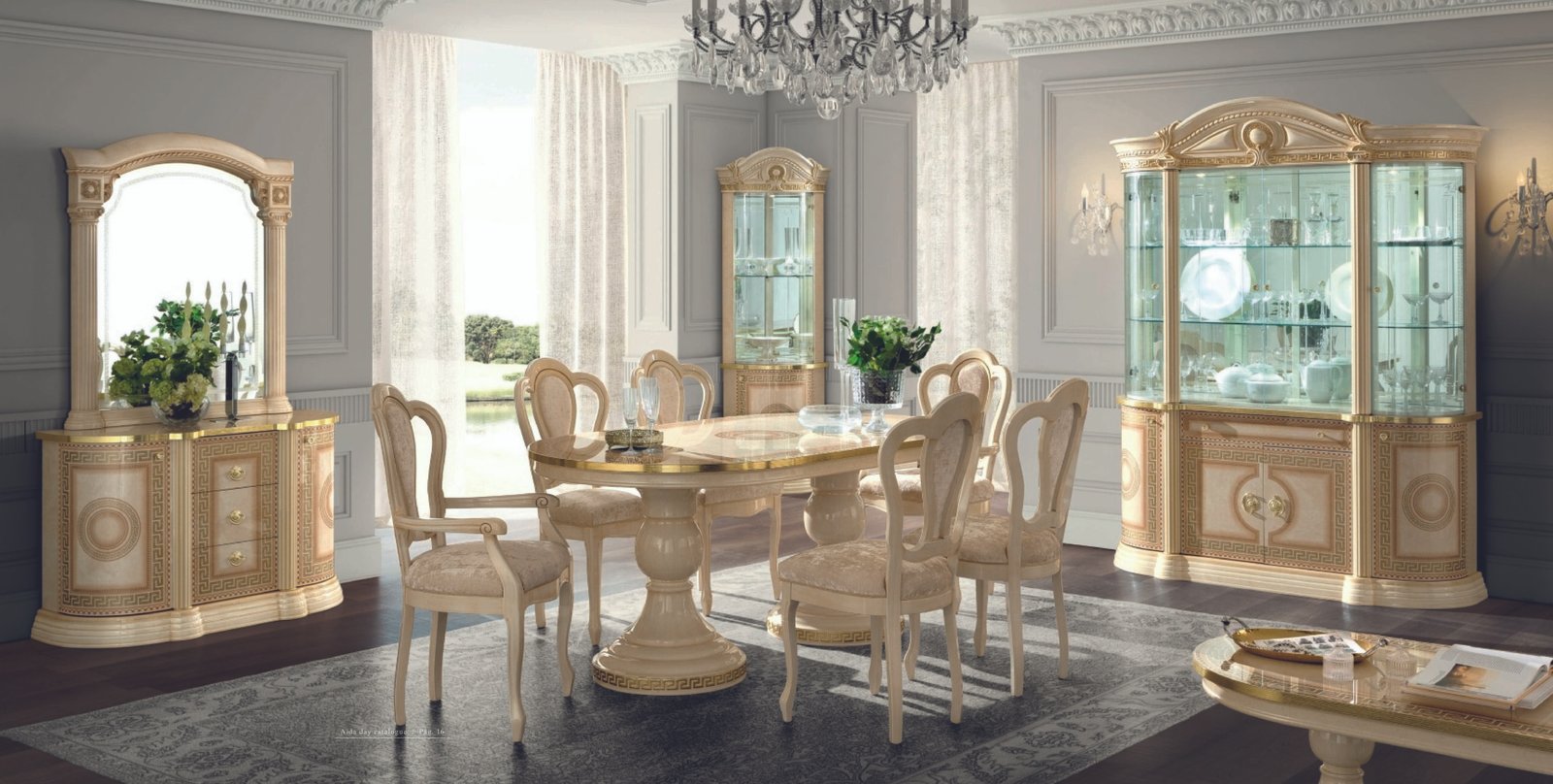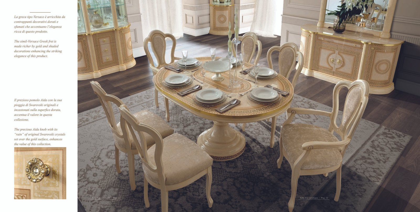 Rich and precious details exalt the luxurious features of dining room AIDA. A unique product where the creative fantasy of the Made in Italy meet the taste of the person who likes home atmospheres full of charm and majesty.