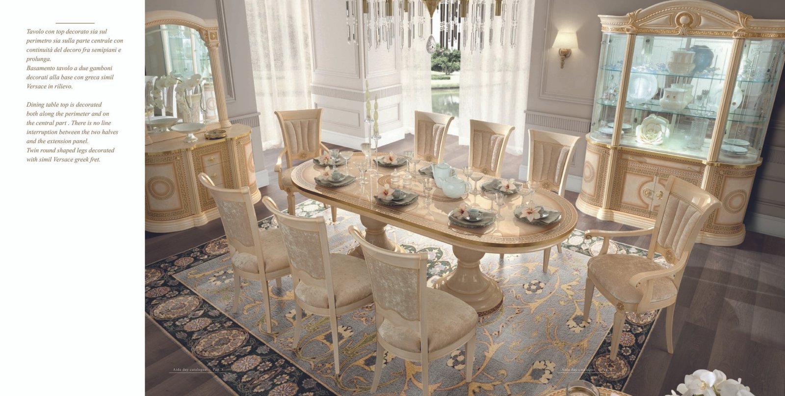 Dining table top is decorated both along the perimeter and on the central part. There is no line interruption between the two halves and the extension panel. Twin round shaped legs decorated with simil Versace greek fret. Dining table are available with the original Aida chair and Michelangelo as per photo.